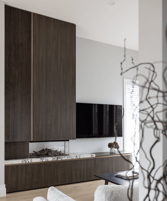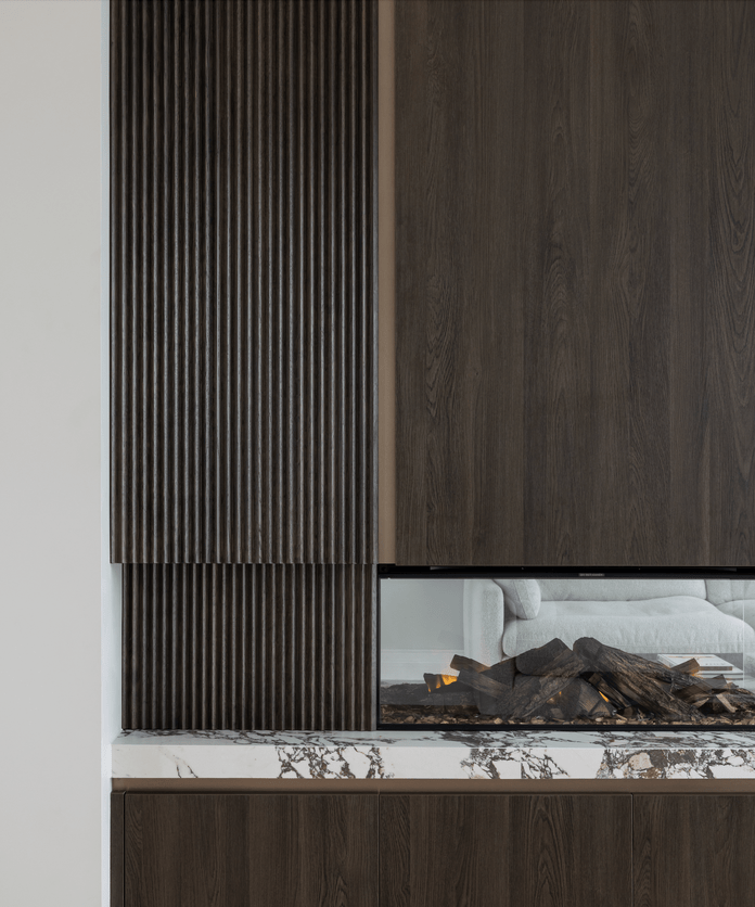 The transformation included a bespoke fireplace wall crafted in rich woodgrain and finished with striking Viola-style tiles; a custom bar featuring layered timber tones and a titanium-gold stone benchtop; and a calming reading nook designed to invite pause, comfort, and slow moments.