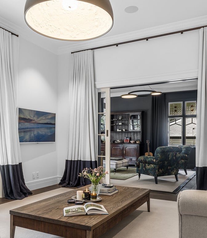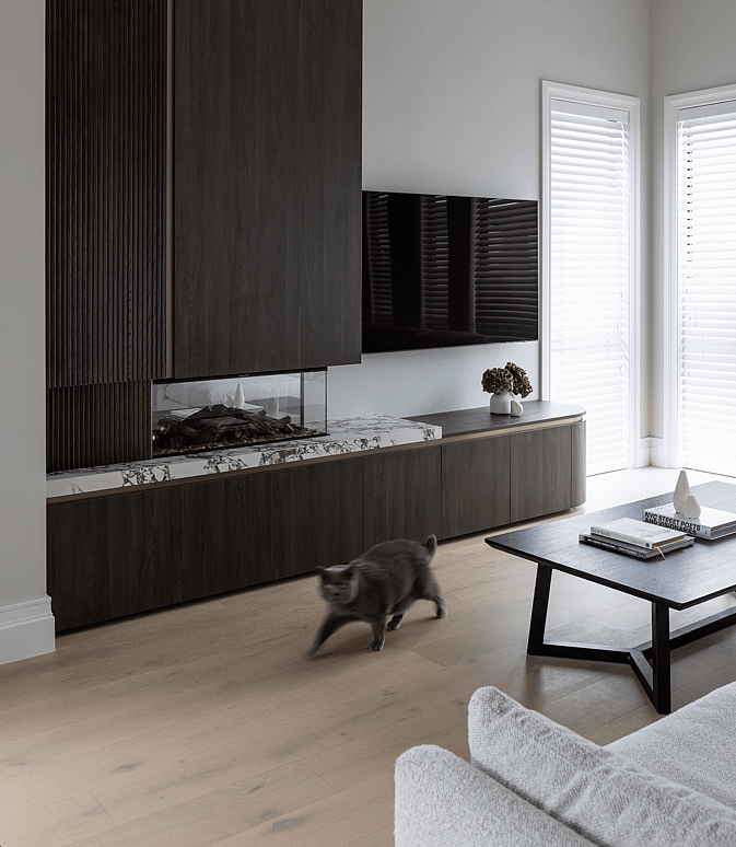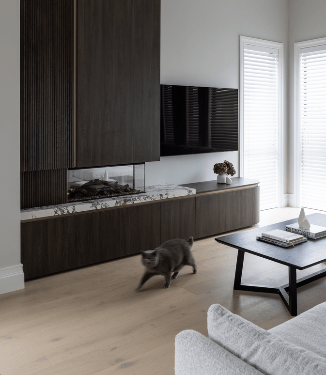 Three carefully crafted spaces - a custom fireplace, bar, and reading nook - redesigned to bring mood, warmth, and cohesion to this family home.