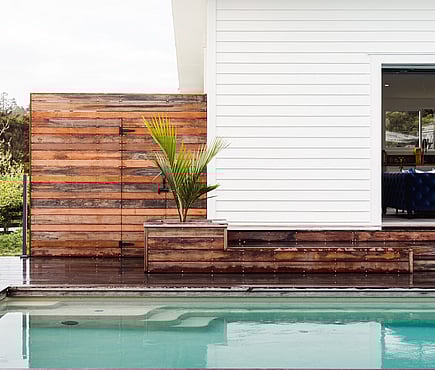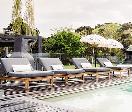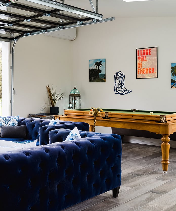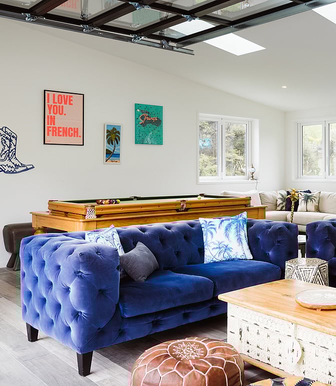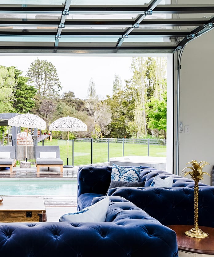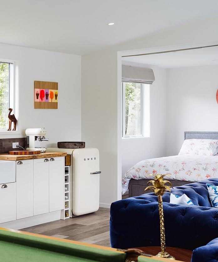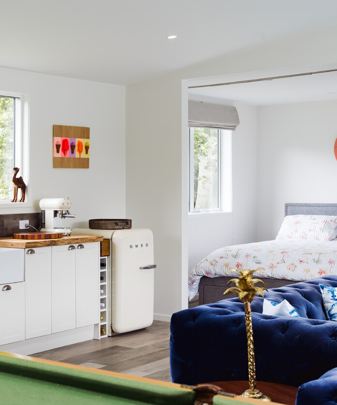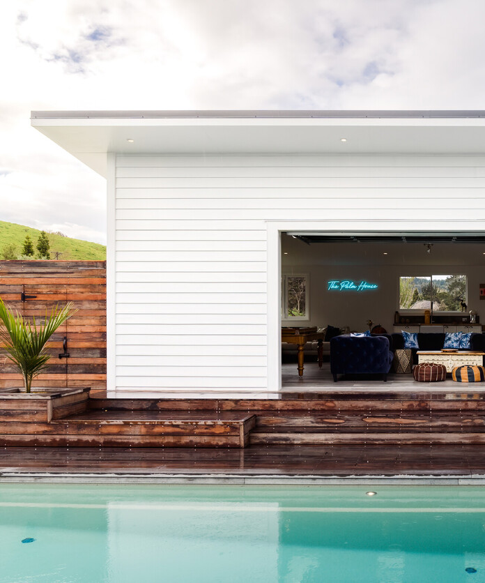 The Palm House is a countryside pool house that radiates fun and flair. Perfect for entertaining, it features a guest bedroom, a walk-in shower, a kitchenette with a minibar, skylights, and a stunning full-height panoramic door that opens directly onto the pool area.