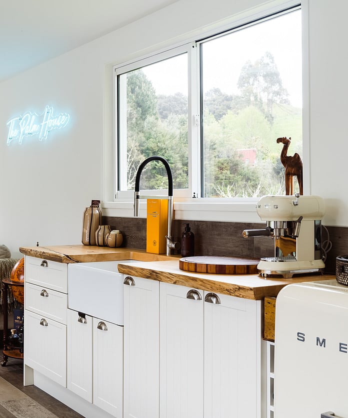 Bright white walls serve as a backdrop for vibrant art pieces collected from the owner's travels around the world, while large picture windows offer stunning views of the lush landscape - just a few of the delightful surprises awaiting you.