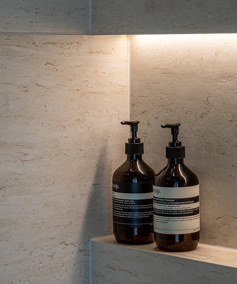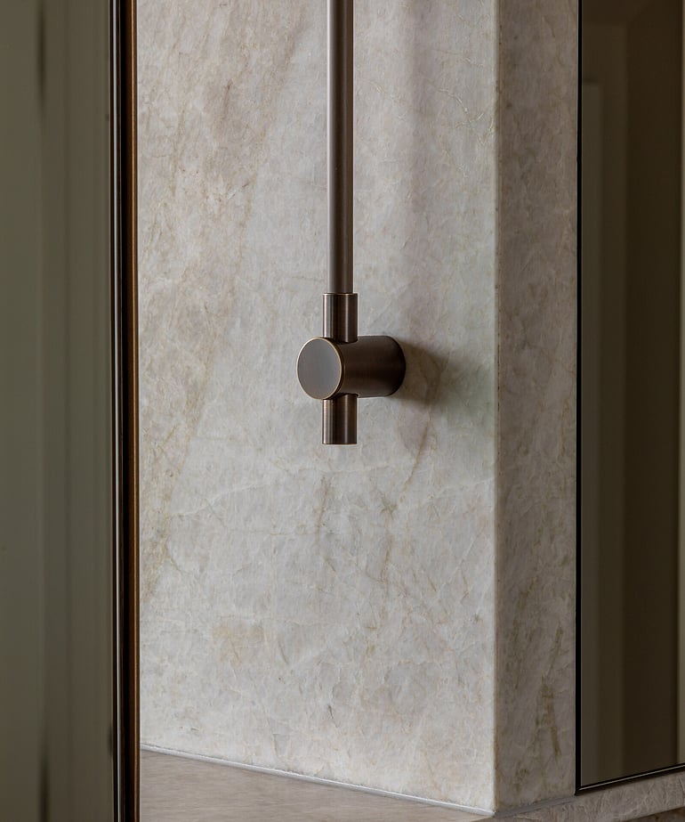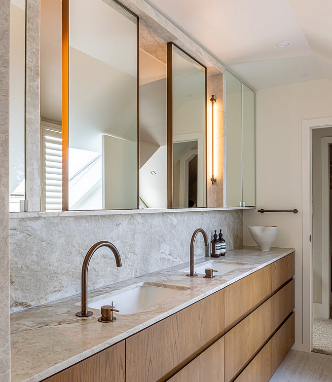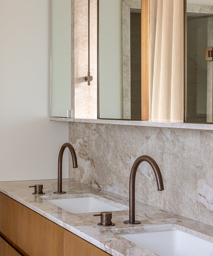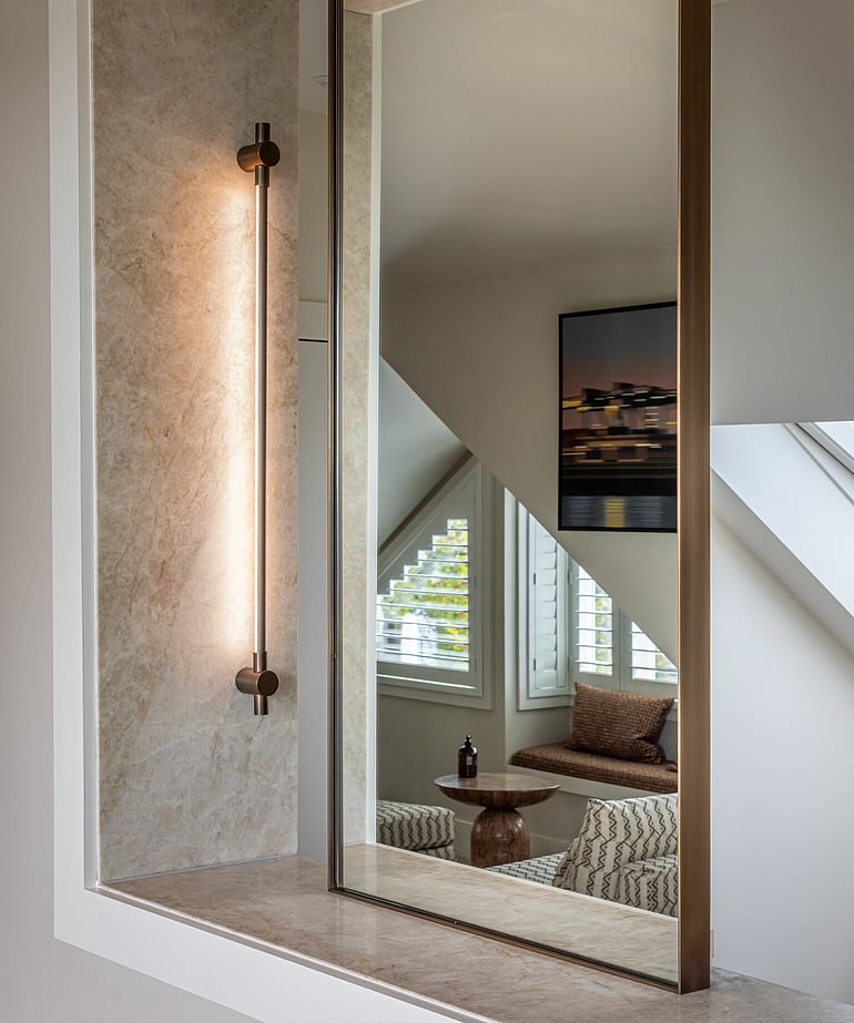 Designed by Inside Out Design, the renovation centres around a rich, tactile palette of honed Taj Mahal stone, wrapping the room in warmth and understated elegance. This is paired with custom-crafted mirrors, bespoke cabinetry, Progetto aged brass tapware, and carefully considered ECC lighting - each element selected to bring depth, softness, and cohesion to the space.